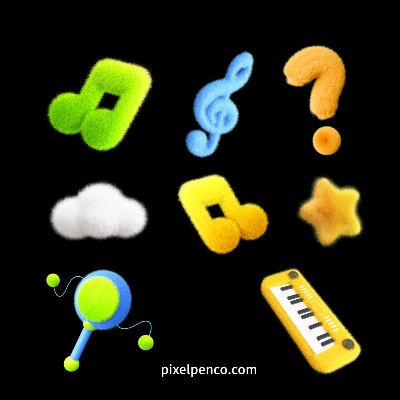 Elevate your creative projects with this meticulously crafted set of 3D fluffy felt-style design assets, featuring Y2K-inspired motifs including flowers, musical notes, numerical symbols, and star icons. Designed for professional designers and artists, this collection combines nostalgic retro-futuristic aesthetics with technical precision, delivering versatile tools for digital and 3D workflows.